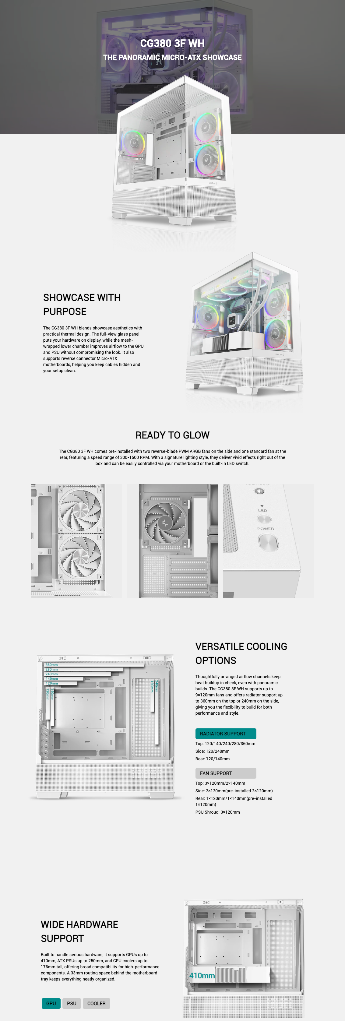Tempered Glass Panoramic Panel: Premium tempered glass side panel offers a clear, unobstructed view of your components, giving your build a sleek and modern showcase look. 7X Pre-Installed Reverse ARGB Fans: Comes equipped with six reverse ARGB fans for enhanced aesthetics and optimized airflow, delivering brilliant lighting and efficient cooling right out of the box. USB 3.2 Gen 2x2 Type-C: Future-ready connectivity with USB 3.2 Gen 2x2 Type-C, delivering ultra-fast data transfer speeds and improved compatibility for modern devices. Supports Double 360mm Radiators: Engineered for high-performance builds with support for up to two 360mm radiators, ensuring exceptional thermal performance. Full-Size GPU Support: Accommodates graphics cards up to 425mm, making it ideal for the latest high-end and RTX 50 Series GPUs. Tool-Free Access Design: Hassle-free installation and upgrades with a tool-free mechanism for quick and easy access to internal components. Versatile Cooling Options: Optimized for airflow with multiple fan mounting points and radiator support, allowing flexible air or liquid cooling configurations